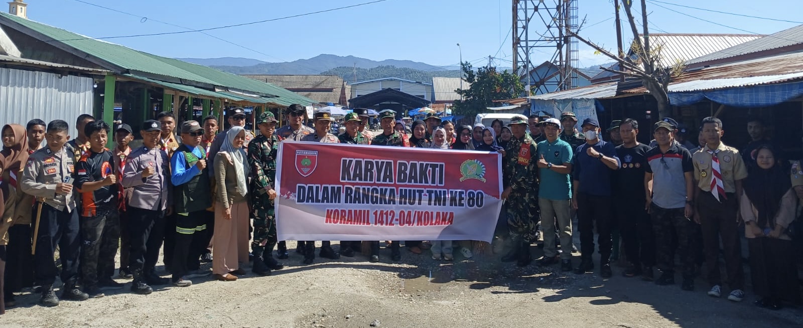 Sorume. Id, Kolaka || Dalam rangka menyambut HUT TNI ke-80, Kodim 1412/Kolaka menggelar kegiatan Karya Bakti pembersihan lingkungan di Pasar Raya Mekongga, Kabupaten Kolaka, Kamis (18/09/25).